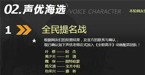 有一点是值得我们开心的,《全职高手》动画的声优是由网友自己投票产生的,也就是说每一个人物都是网友们最赞成的配音演员来做的,肯定能够最大程度的还原原著的情况,大家对《全职高手》动画cv的演绎心服口服,至少在小编看来,世界上找不出第二个人比阿杰更适合配叶修了。