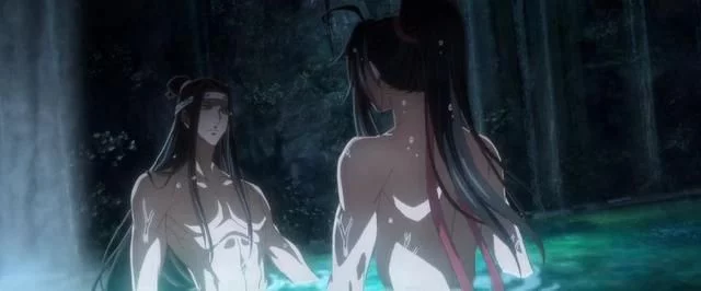 中间蓝忘机和魏无羡两位美男,半裸着身躯在同泡冷泉的画面,真是一饱眼福啊!单凭这一段画面,小编都能刷一个星期了~